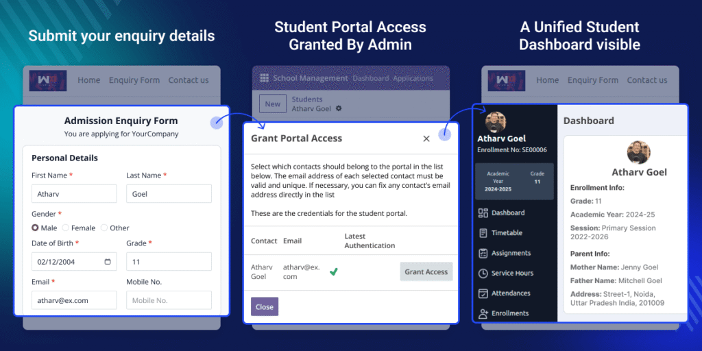أتمتة عملية قبول الطلاب الجدد بالكامل، بدءًا من نموذج التسجيل الأولي، ومتابعة مراحل الطلب، وإدارة استمارة القبول، وربط الطالب بالسنة الدراسية والمناهج المعتمدة.