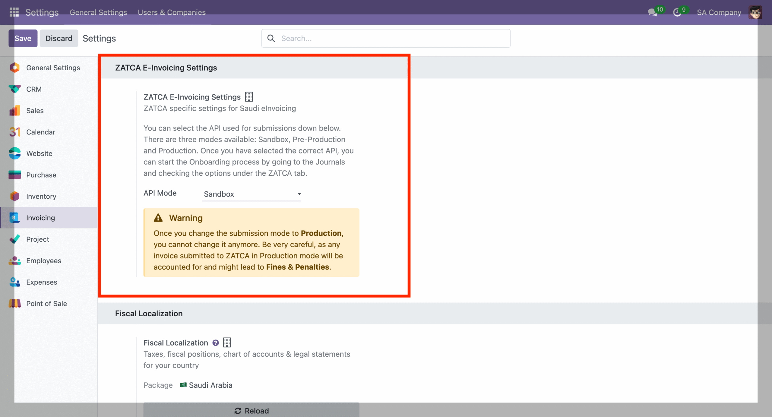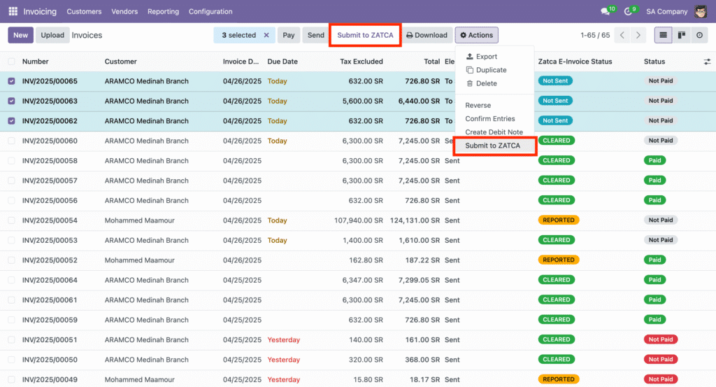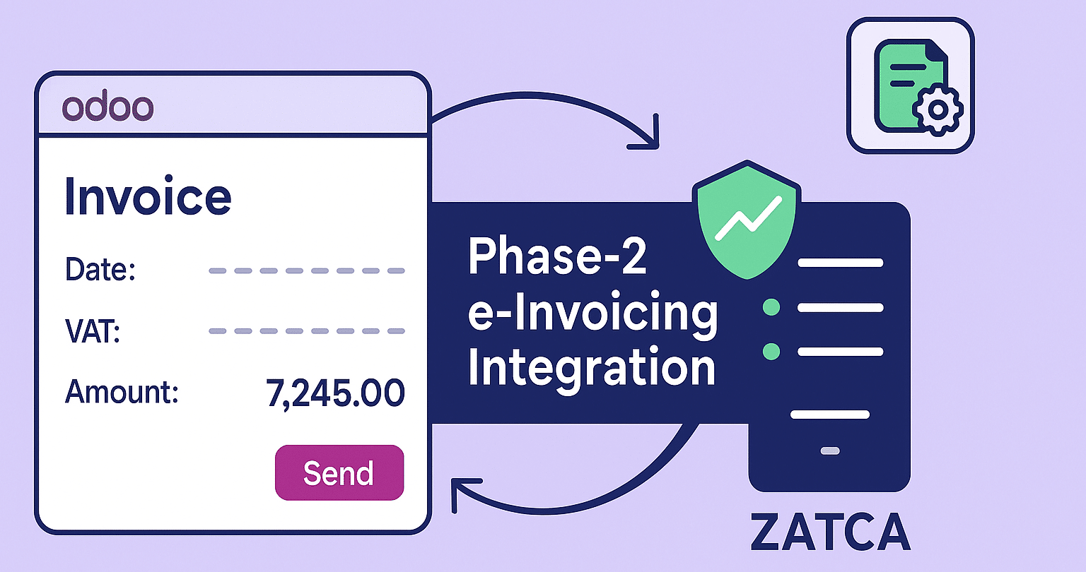 يساهم التكامل بين نظام اودو المحاسبي لإرسال الفواتير الصادرة من نظامك إلى منصة ZATCA،في الحصول على الاعتماد (Clearance) والختم الإلكتروني، وإعادتها إلى نظامك تلقائيًا قبل إرسالها للعميل. هذا يضمن لك امتثالاً كاملاً، تجنب الغرامات، وأتمتة دورتك المحاسبية بالكامل دون أي إدخال يدوي.